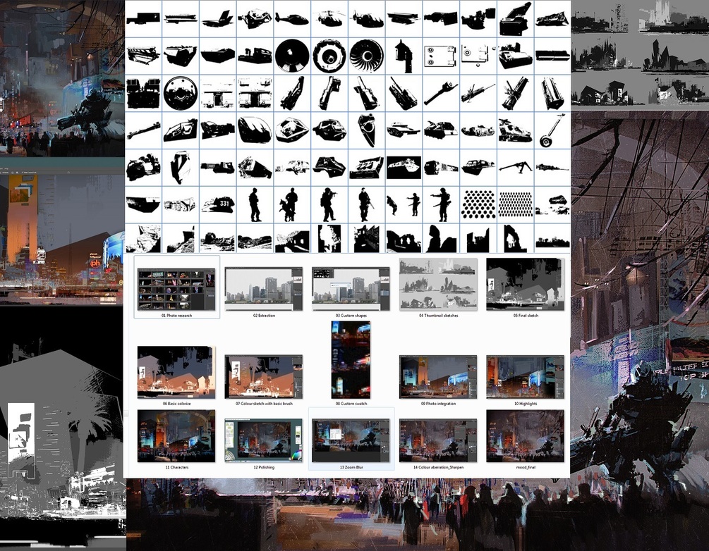 A collection of custom shapes that I really enjoy using for visual explorations. It includes 100+ custom shapes such as mechanical parts, landscape and cityscape shapes. I have also included the original psd file and the step by step images of the tutorial that I have featured on my Youtube channel "The Art Journal of Donglu".